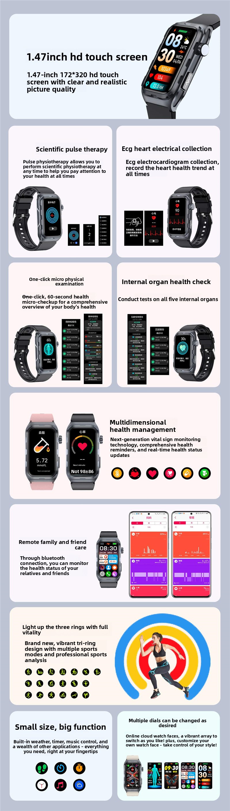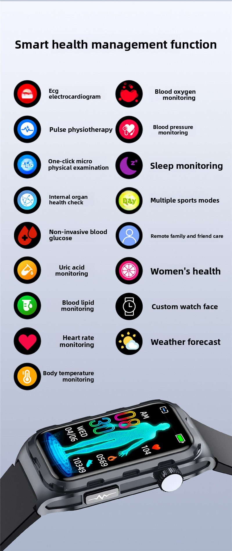 Health Monitoring: Comprehensive tracking including ECG, heart rate, blood oxygen, blood pressure, sleep, and body temperature with 24/7 dynamic monitoring.